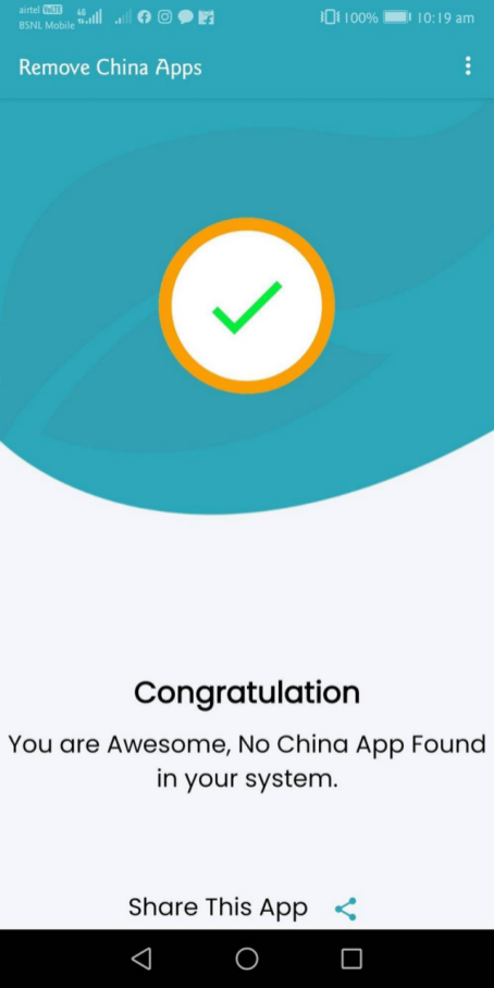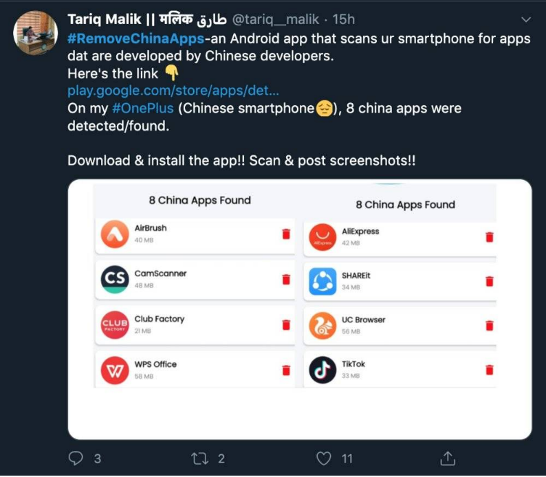 许多印度人在推特上分享了使用Remove China Apps的截图,并鼓励其他人下载这款软件,扫描自己手机里的中国App并卸载掉。