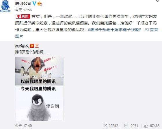 目前案件依然扑朔迷离,截至《中国经营报》记者发稿,腾讯方面未有更多回应。腾讯公司在官方微博上则回应“被骗”一事,称一言难尽,并为了防止类似事件再次发生,以1000瓶老干妈为礼品征求类似线索。